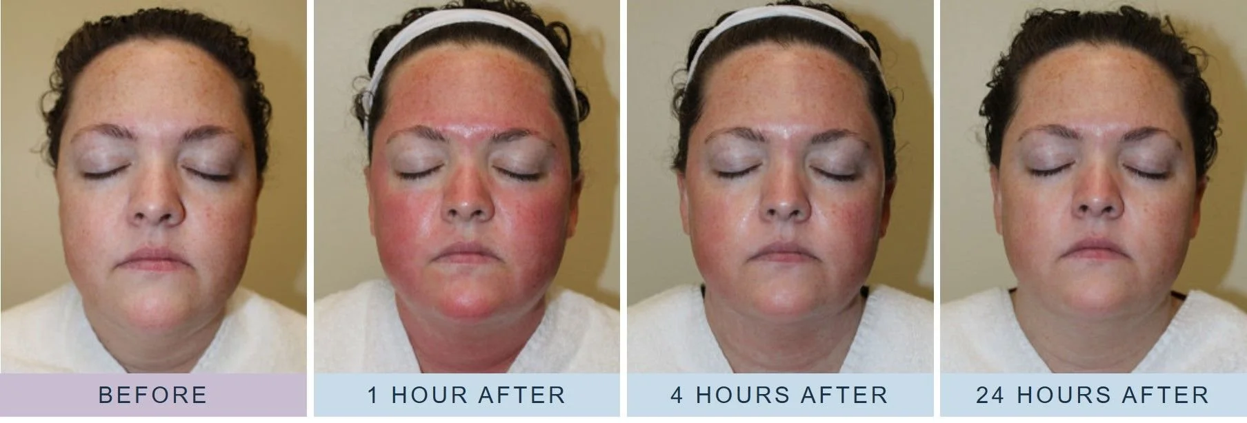 Hieronder zie je een foto hoe de huid eruit ziet na een behandeling. De eerste 24u mag je niks anders aanbrengen dan het product dat je meekrijgt. Hierna mag je terug jouw producten aanbrengen. Tussen dag 2-6 kan het zijn dat de huid op sommige plekken wat schilfering geeft. De eerste 72u moet je zonnebescherming dragen en mag je niet zonnebaden.